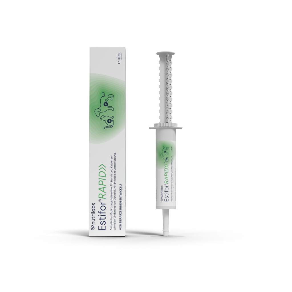 Estifor® RAPID Paste provides fast and reliable relief for dogs and cats suffering from acute diarrhoea. It also contains a comprehensive combination of prebiotic, probiotic and postbiotic components to provide the best possible support for the gut in rebuilding a stable microbiome. Damaged gut flora often leads to recurrent diarrhoea, which is why early stabilisation is particularly important.